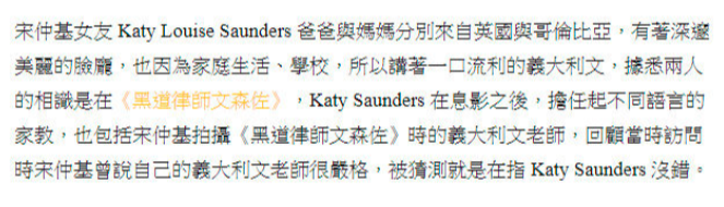 据说宋仲基是在拍摄《黑道律师文森佐》时,需要找精通意大利语的老师辅导,于是就有人介绍了Katy,后来两人在浪漫的意大利语学习中擦出了爱火。