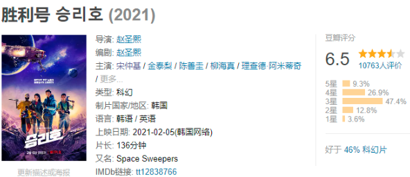 最开始宣传的大制作、大卡司,首部韩国太空背景科幻巨作,到后来因为疫情关系一拖再拖,连影院都没进去,最后只能放在网飞上播,豆瓣评分刚过及格线。
