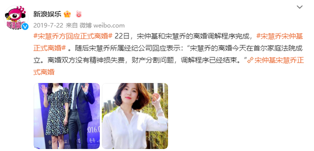 7月22日,宋仲基宋慧乔正式离婚。宋慧乔方面称双方没有精神损失费、财产分割问题,宋慧乔则在社交平台删除了所有与宋仲基有关的图片。