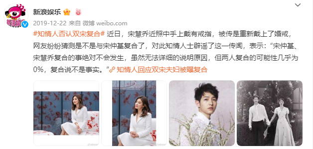 另一次则是2019年12月时,宋慧乔因为戴的戒指像当初的婚戒,因此被传复合。
