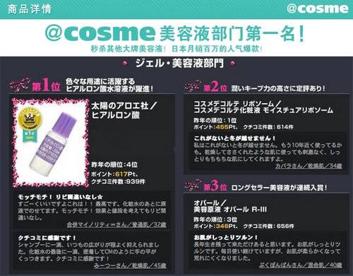 大家知道要挤入日本COSME风云榜是多么艰难的一件事情,而在大牌坚实羽翼的覆盖下,太阳社玻尿酸保湿原液,这款默默无名的原液,宛如一瓶脱颖而出的黑马,实在让人难以不去注目!严格来说它不是一款化妆水或者是精华液,它是用来做化妆水或是精华液的浓度原液(1G的玻尿酸能够锁住6L的水)!!!