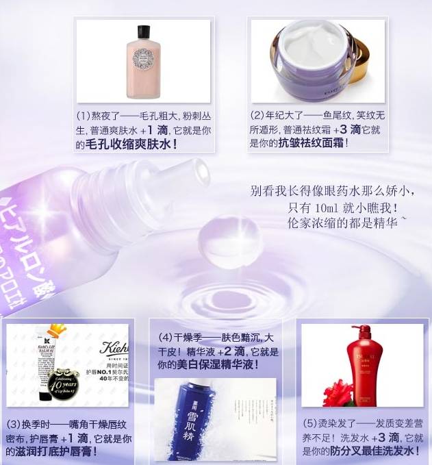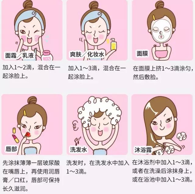 用法就是随心所欲自由自在~!啥都能用,添在所有跟美容搭边的地方——面霜,化妆水,面膜,洗发液,等等,想得到的都行。