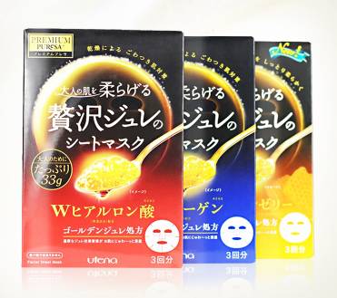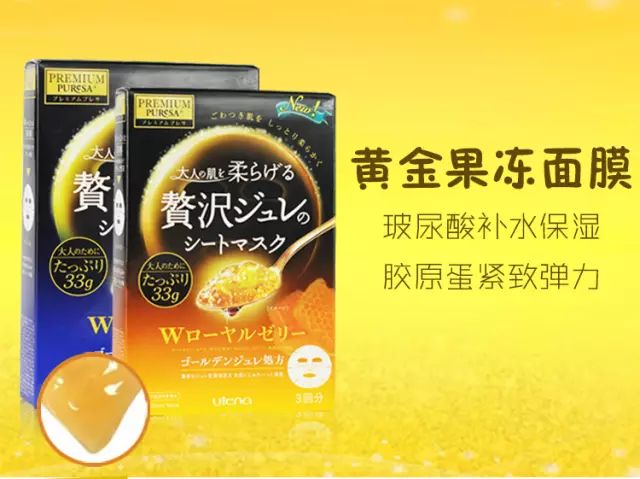 日本Utena佑天兰双倍玻尿酸黄金果冻奢侈面膜,不含合成香料、不含合成色素、不含矿物油、不含酒精、不含动物性原料、无添加紫外线吸收剂。每盒含3片,每片美容液高达33g