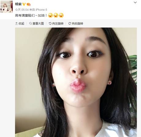中新网6月7日电 今日,演员杨紫晒出一张美艳自拍,并留言称:“高考滴童鞋们~加油!”照片中的她,化着精致的妆,嘟嘴卖萌.但网友纷纷留言,表示“真的认不出这是谁.”有网友称:“一眼看成贾静雯”,“还以为是叶一茜”,“看成了陈意涵”,“好像佟丽娅”,“乍一眼以为是娜扎”....