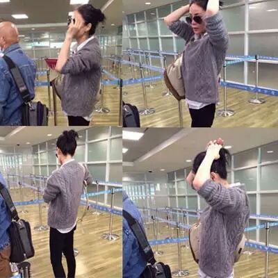 ▲在韩国某机场被网友目击到的王菲,一身灰色毛衣+白衬衫+黑色紧身裤,配上一个丸子头,青春范十足。