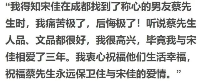大 宋 佳 从美国回来后,认识了张纪中的得意弟子——导演、摄影师于 敏,两人聚少离多,分了手。之后,大宋佳和房地产商蔡 程相爱了,于 敏还发文表达祝福。