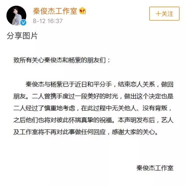 今天下午4点半,两家工作室同时发了声明:秦俊杰和杨紫和平分手,两人已经决定回到朋友关系。