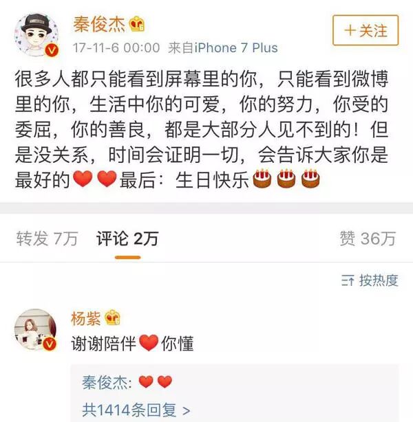 秦俊杰在庆生微博里力挺女友