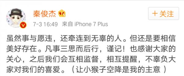 秦俊杰发了条微博说凡事三思而后行,之后我们会互相监督,相互提醒,让小猴子(杨紫)空降是他的主意。