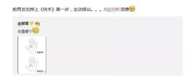 大部分网友还是不相信此类荒唐留言,不过其实刘烨和谢娜并非老死不相往来,从刘烨参加《爸爸去哪儿3》后,网友最期待的就是刘烨父子上《快乐大本营》与谢娜碰面,日前,刘烨评论谢娜微博被网友截图,两人疑似已经破冰和解,看来两人在快本同台可能性很高。此前网友热议的刘烨谢娜分手原因也被曝光,刘烨曾称谢娜走红后提分手,而谢娜父亲则称是刘烨酗酒,一时间引发粉丝骂战。 细心的网友浏览谢娜的微博会发现,谢娜和刘烨偶尔也会微博互动。谢娜通过微博发表一张网络测试图片,并发问,称:“你是哪个?”图片分别是两只纹路不同的手掌,一只写有“挥霍浪费”,一只写有“勤俭持家”。网友对此测试都表示出浓厚的兴趣,纷纷对照自己的手掌纹路“看图答题”。下面上图。