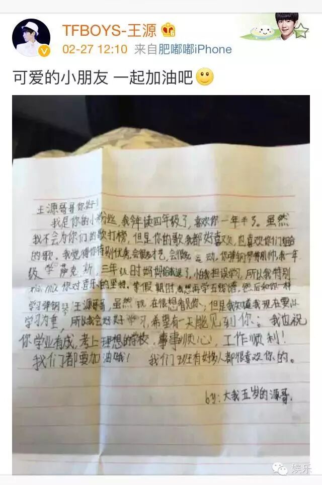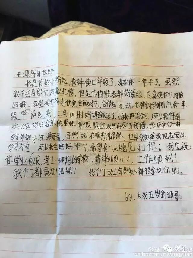 TFboys王源收到四年级小朋友来信,稚嫩的字迹萌化网友。