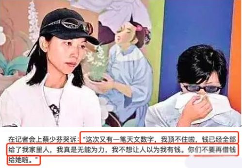 精神极度崩溃多次想要自杀的蔡少芬在记者会哭诉:“我顶不住啦,钱已经全部给了我家里人,我真是无能为力。其实好久之前已经帮妈妈还过好多赌债,所有收入都给了她,三年前我已经抵押了两层楼还债,以为可以偿还所有的债目,但刚刚知道还有好多,大到超过500万的天文数字,我好怕,我真是无能为力啊!”