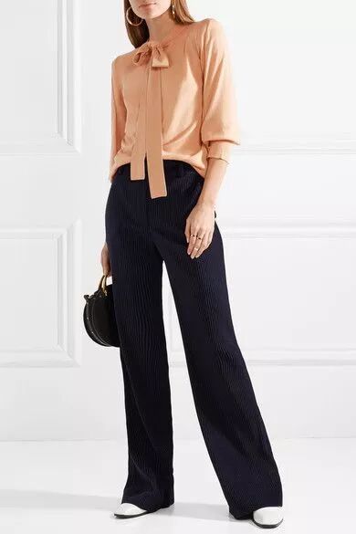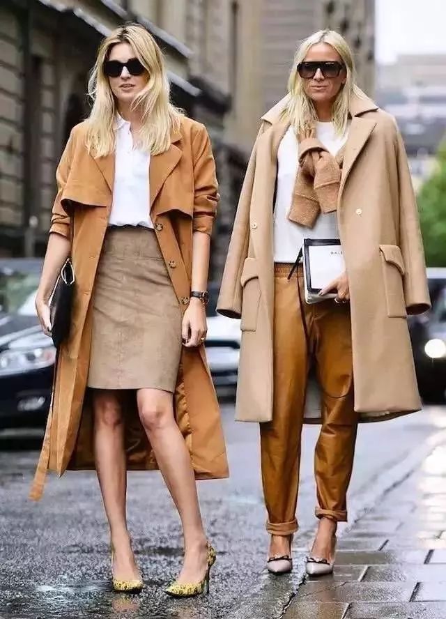 要么就是找到同色系单品搭配,比如焦糖色配米白、浅棕等等。另外值得注意的是,裙装比裤装更容易打造出温柔的效果。