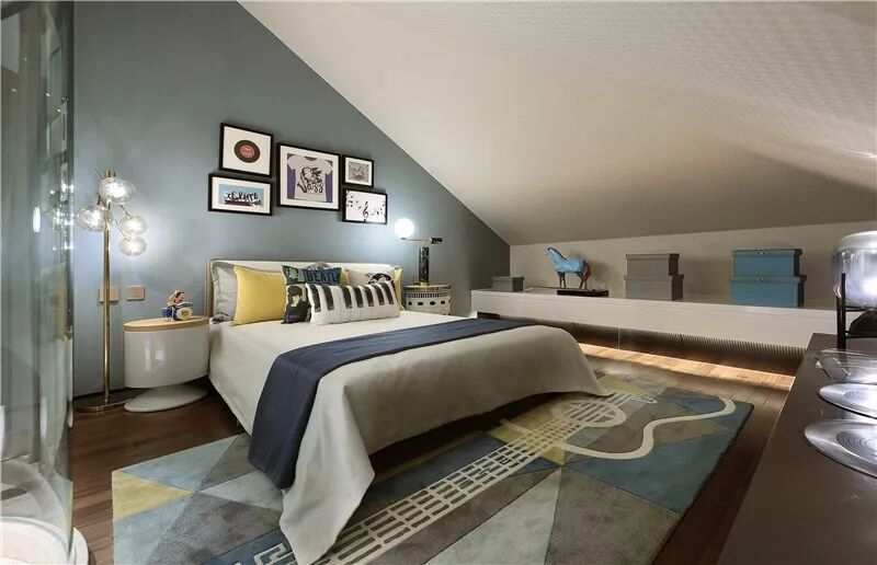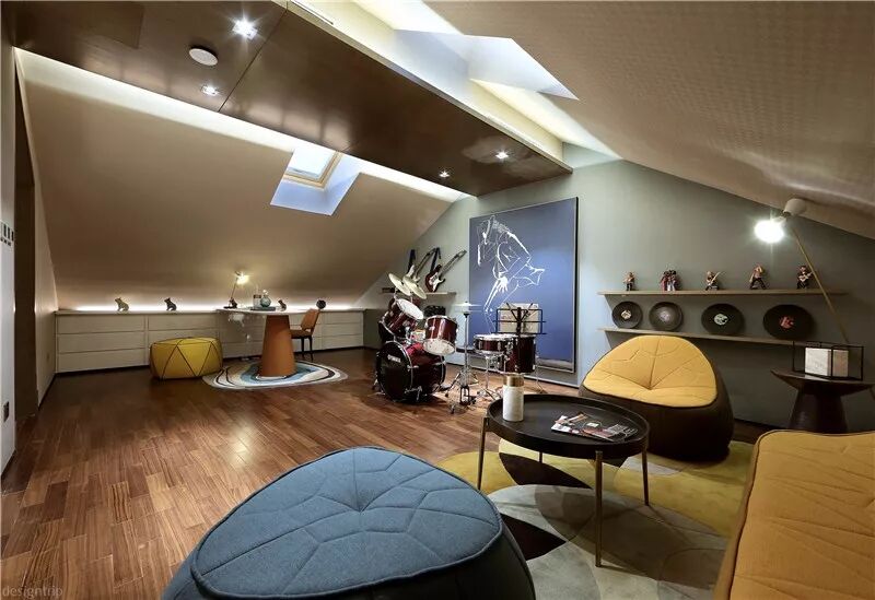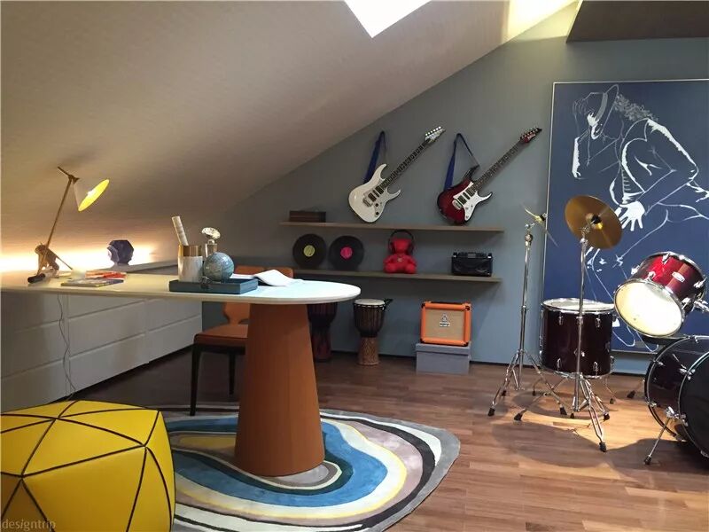 男孩房以“乐”为主题,一个小小的阁楼,开辟出一个男孩对音乐梦想的天地。当父母培养孩子努力学好某一种技艺时,也许正是他们年轻时的梦想与爱好,所以当孩子拿起吉他弹唱时,父亲可以为他打鼓,母亲为他伴奏,小妹妹也凑上来摇起小摇铃,一个家庭乐队就这样成立了。