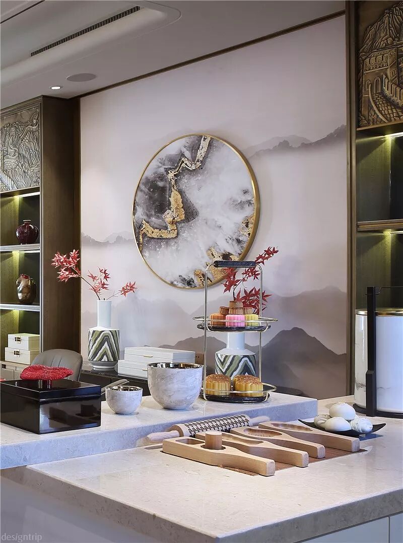 餐厅以团圆喜气的造形与色彩相和,本案开放之时正值国庆中秋佳节,背景之苍山明月与吧台上手工制作的月饼,恰如其氛地突显了传统佳节的仪式感。令人倍感亲切,而有礼有节。