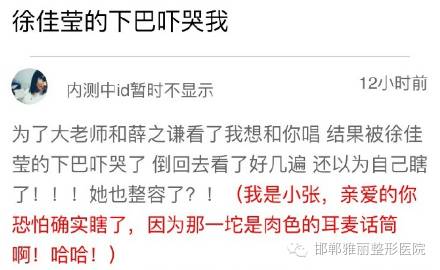 从图片来看,徐佳莹的下巴上确实多出了肉色的一块,然而放大仔细端详后便可以发现,这并不是下巴上多余的假体,而是电视台用的肉色耳麦。