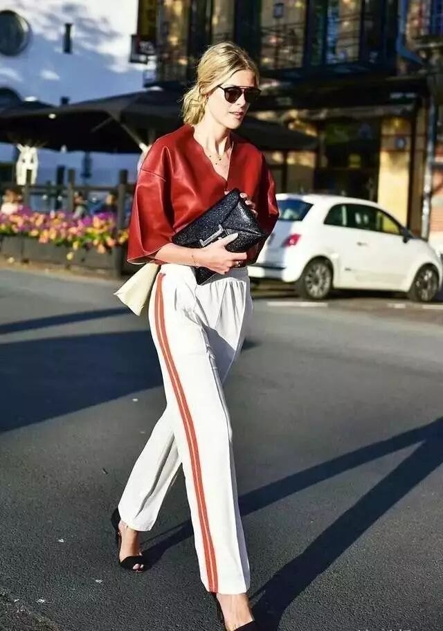 红色条纹上衣+牛仔阔腿裤,再加上一双女人味十足的半头鞋,浑身散发着妩媚的知性,红色和牛仔可是绝配呢。