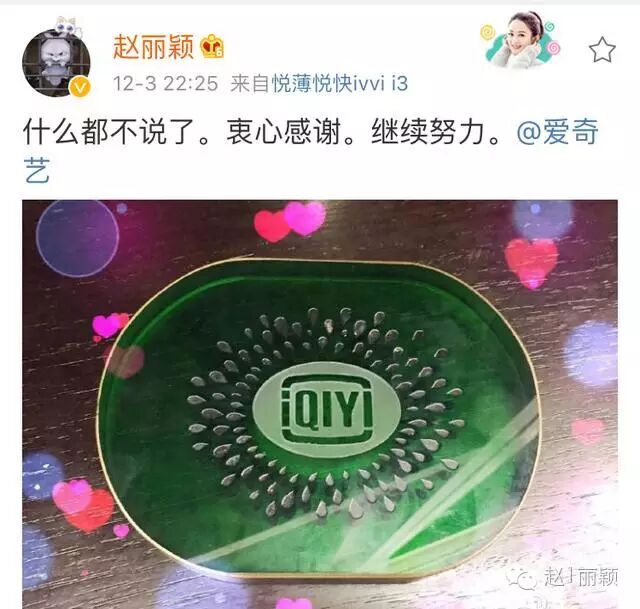 直播在晚上10点左右结束。之后没有多久,赵丽颖便在微博里晒出了所得的奖杯。并在发文处写到,什么都不说了,衷心感谢,继续努力。