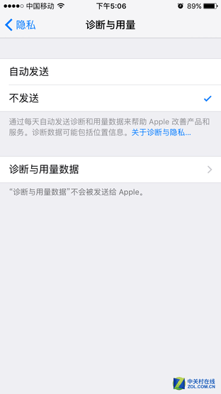 这个其实是苹果公司搜集用户数据,可以不断完善自我产品的搜集方式。只是,每天都会自动发送诊断和用量数据,诊断数据还可能包括位置信息。看到这个信息,就会让人不寒而栗,当然这个功能也是可以关闭的。进入“设置”--“隐私”--“诊断与用量”,选择“不发送”。