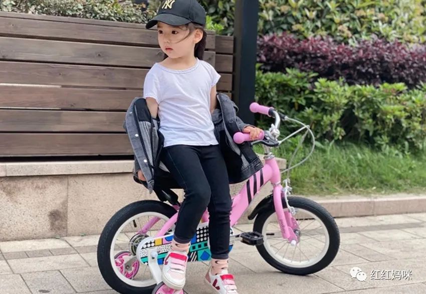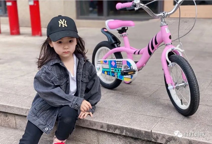 照片中女儿穿着一身休闲的牛仔衣,戴着一个可爱的帽子,推着自己粉红色的自行车,第一张图片孩子正靠在自行车上,可能是太热了,孩子就把衣服袖子搭在手臂上,第二张图片女儿高兴的骑着自行车,那个样子高兴极了,孩子抿嘴唇的动作真的是太可爱了,可能是因为母亲带孩子出去玩,所以孩子异常高兴,一会儿骑车,一会儿上蹦下跳,