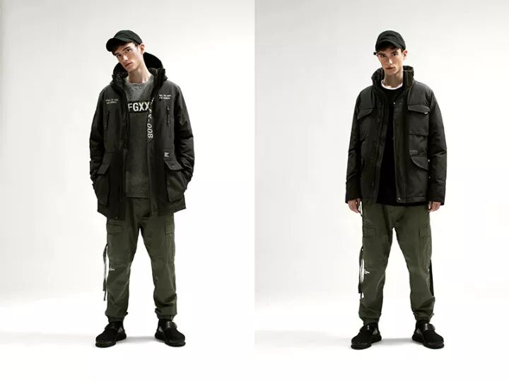 此系列以军绿、卡其色、米黄色为主调,经典迷彩外套和点缀全身的军章体现军服精髓。主打款式包括卡其色MA-1薄风衣和多功能军事外套,洋溢浓厚军事格调。