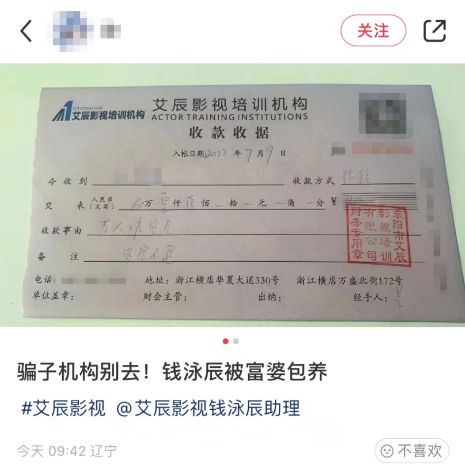 该网友还补充表示钱泳辰已经被富婆包养了,这个培训机构名叫“艾辰影视培训机构”,其中“艾”代指女富婆,“辰”则是钱泳辰。