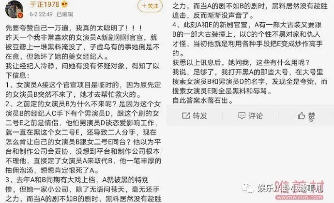 为什么有接替这一说呢,于正透露,因为女演员B和男演员D有已共同经纪人C,男演员D和剧中女演员E是前男女朋友,还是因为经纪人C不断黑女演员E而导致分手的,所以女演员B才没出演。在于正的小作文中,有3点是讲经纪人C黑人的,而且最后还总结,经纪人C有养号专门黑人。