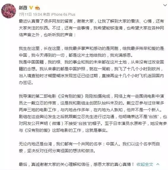 7月11日,赵薇再次回应,发表正式声明称:“我是中国人,坚决反对分裂”。还表示:戴立忍明确表达不是“台独”,水原希子没有参与这部电影的工作。