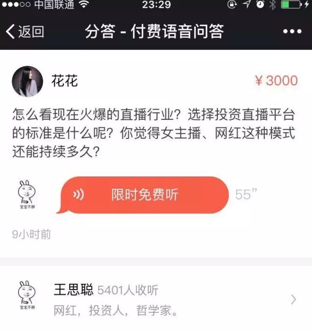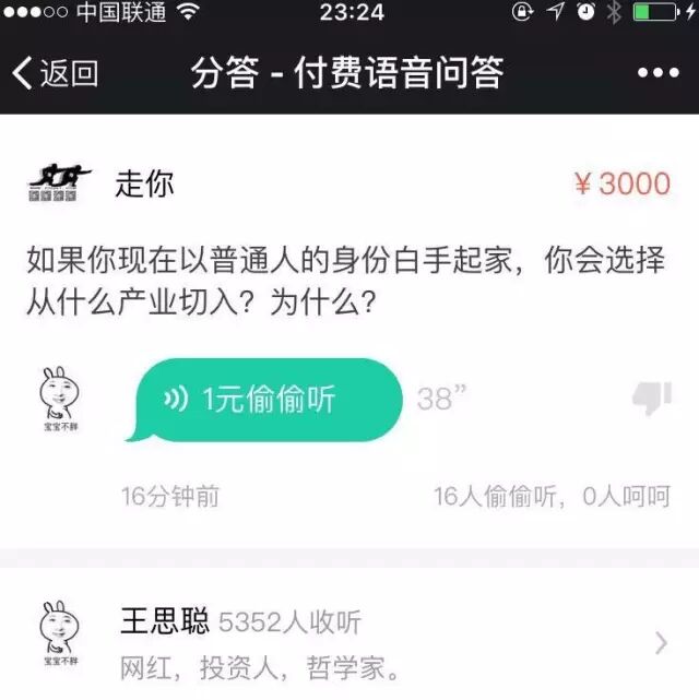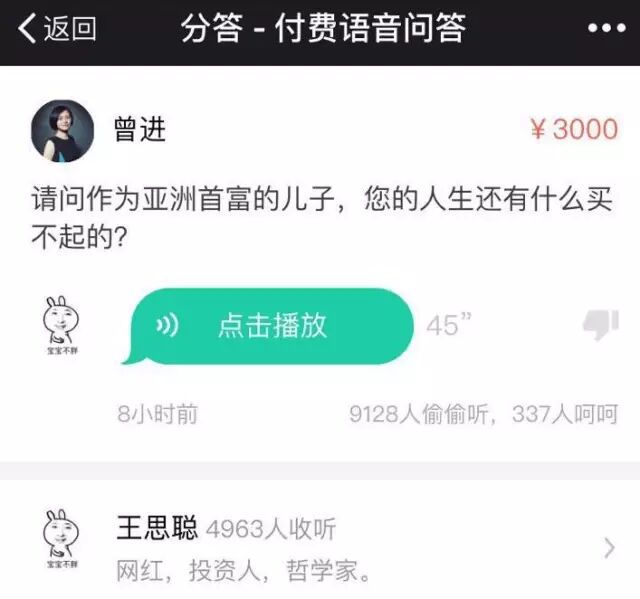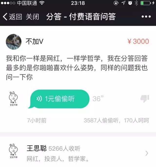 分答火了,一个很有创造力的产品,这两周来迭代速度也非常快。里面很值得关注的是“投资王思聪”现象,一台活的印钞机,不但给自己印,还给用户印。提问他一次是3000元(目前涨到4999了,知识终于也可以是会升值的奢侈品:)按分答均价看,这绝对是天价,按王思聪身价看,这又是低到不可思议的可对话价格。而且他的回答都挺坦诚有质量的,偷听的粉丝和数量快速上升,第一个提问者,偷听已经快破万,不仅得到了王思聪的答案,赚回了3000成本,还盈利2000了,对王思聪提问变成了很划算的投资模式,多神奇的平台,知识分享可以成为好的投资。