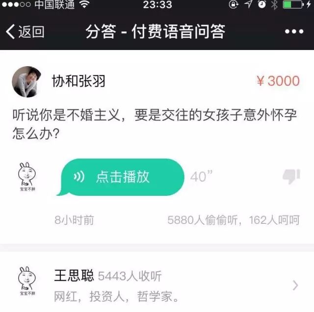 2. 付费提问也解决了知识网红变现的模式。整个提问价格由你来定。王思聪定价4999元,Ayawawa定价500元,还有一些名人定价15元。反正各有各的定价。这种定价也设置了最初步的门槛。让知识不再是免费的。用户会更加理智提出每一个问题。同样,回答者由于是收费回答,也会更加认真对待这60秒的语音沟通。所以说,这个付费门槛将分答变成了精品店模式,过滤了大量无效的人和问题。同时网红通过这种模式,也达到了部分变现的目的。