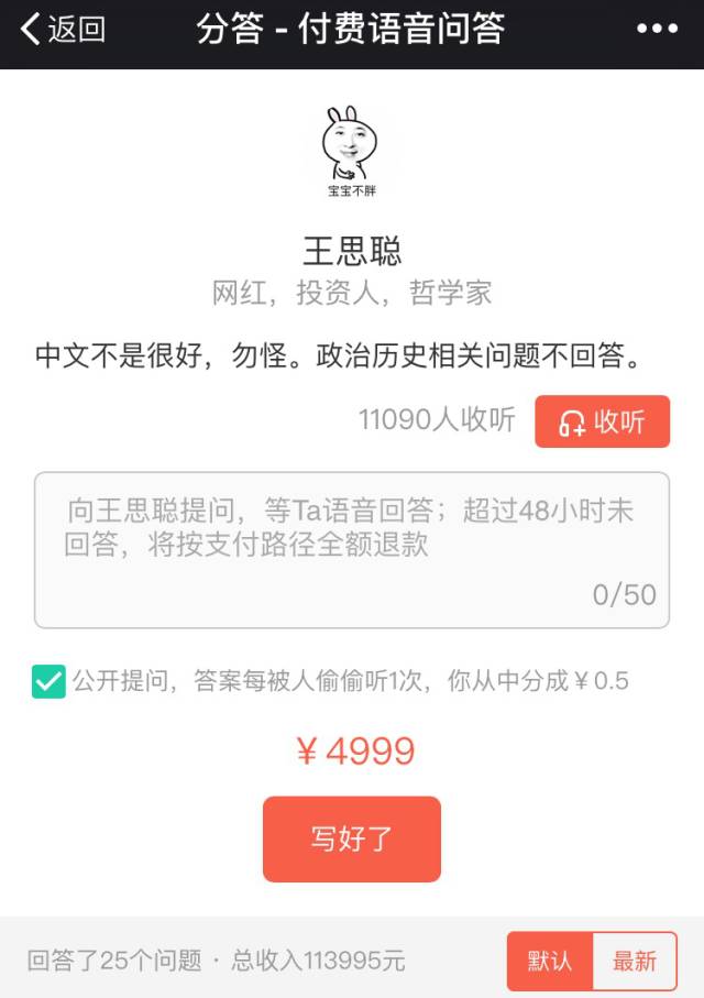 王思聪在『分答』的头衔【网红、投资人、哲学家】,他这样介绍自己的【中文不是很好,勿怪。政治历史相关问题不回答。】现在的提问价格为4999元。