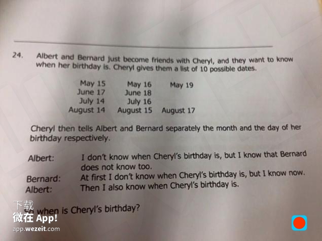 你知道谢丽尔的生日是哪天了吗?(关注后请把你的答案在公众平台回复给我们,前二十个答对的同学有红包!)今天是第430期(2015年4月15日),