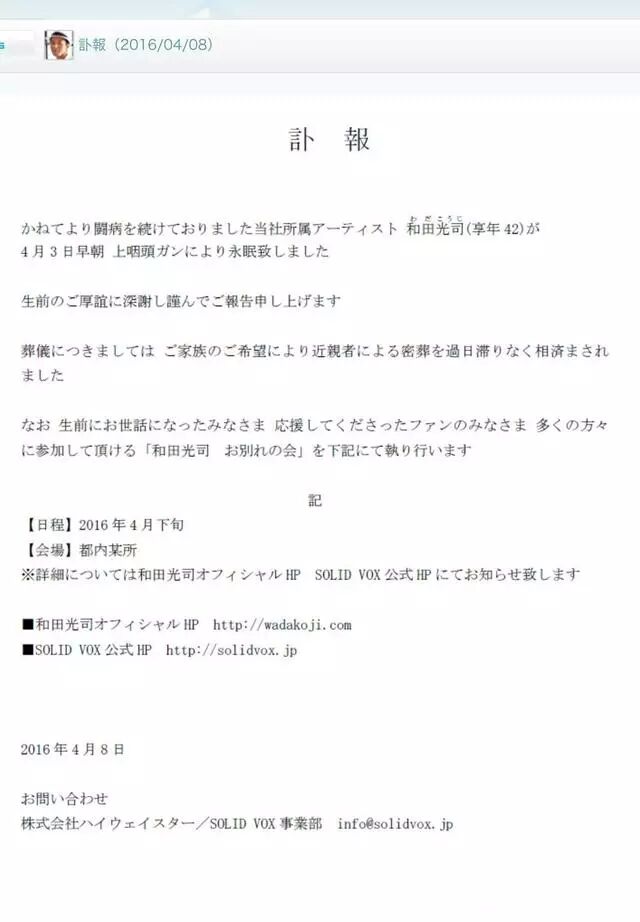 目前由于家属的要求,光叔的葬礼只会由亲近的好友跟亲戚来参加,不过4月下旬将会举办一个粉丝们参加的“和田光司告别会”。具体消息会在接下来一段时间里公布。