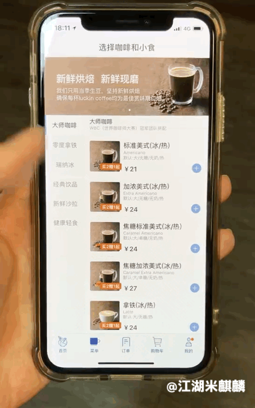 APP中的餐单和普通咖啡馆一样,涵盖咖啡、其他饮品,以及沙拉与三明治、麦芬等简餐。