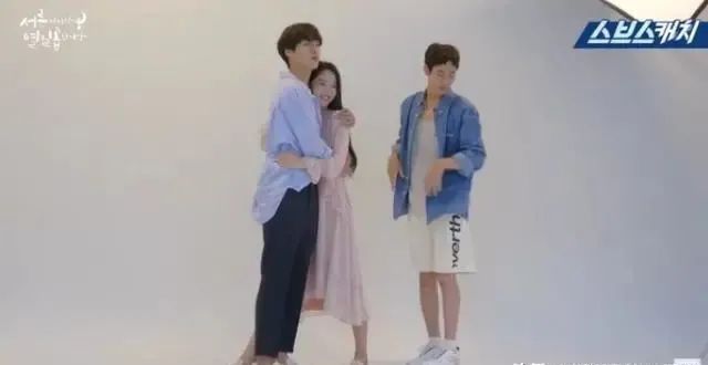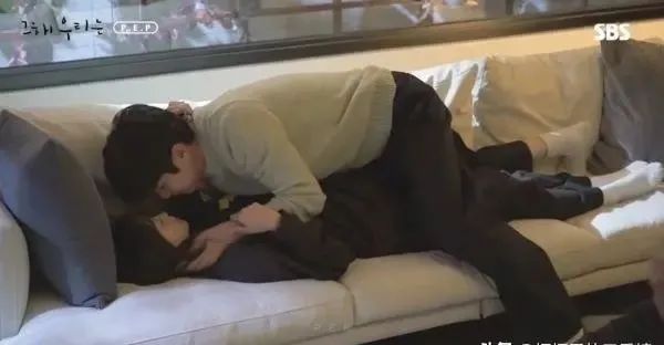 另一幕崔雄延秀「沙发吻」花絮,也能看出金多美的大长腿!只见金多美被崔宇植扑倒在超长版沙发上,金多美躺平、伸直双腿,几乎占据了整张沙发。