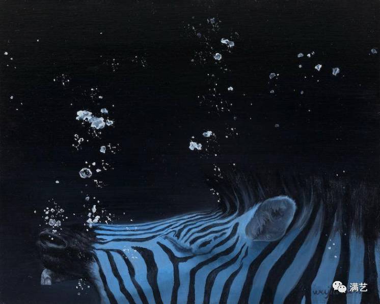新系列作品中马的全身用明亮的蓝色处理,画面中成串的气泡形态让人感觉一切被置于水下。除马之外的物象都是暗灰色调,虚无的深色背景仿佛是无边际的宇宙空间。