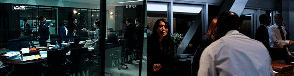 故事一开始,就致敬了美剧版中律师团队会议室大型争论场景。