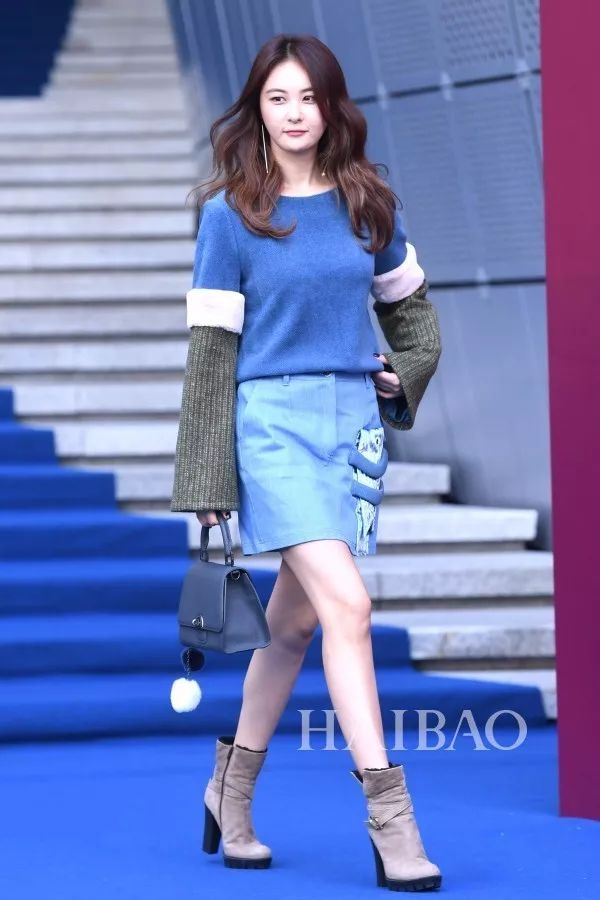恩书则选择了时髦的牛仔短裙来搭配个性毛衣,甜美的笑容让小编欲罢不能啊