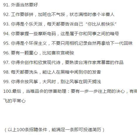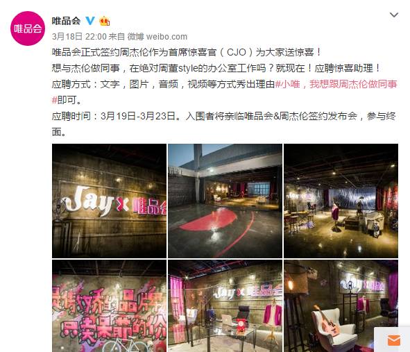 Social阵地不只有双微。唯品会就把这场战役的第一枪打响在各大招聘网站。3月9日,唯品会发布“惊喜助理”的岗位招聘,工作职责:协助唯品会CJO;100条岗位要求几乎都与周杰伦的歌曲相关。看似一则奇葩招聘启事,实则在传递一个讯息:唯品会要和周杰伦发生关系。
