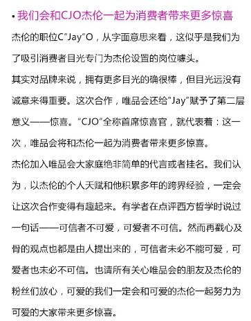 在招聘启事经过4天发酵后,3月13日晚微博八卦博主po出一段有关“周杰伦与唯品会”聊天记录,看似无意间抖出的一张“唯品会首席惊喜官(CJO)周杰伦”的工牌,却又再一次把“唯品会和周杰伦”的关系推进了人们的视野。
