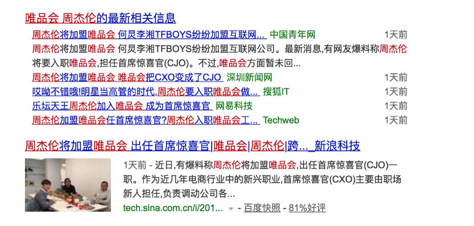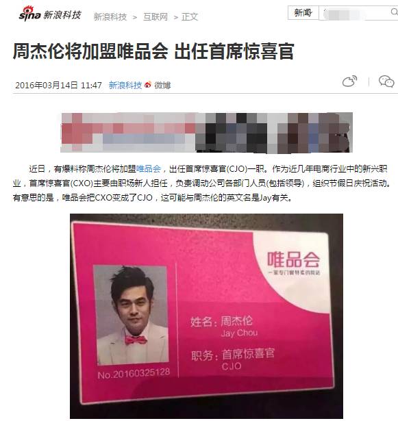 “周杰伦跨界电商,入职唯品会”的曝光新闻在各大新闻门户不胫而走。