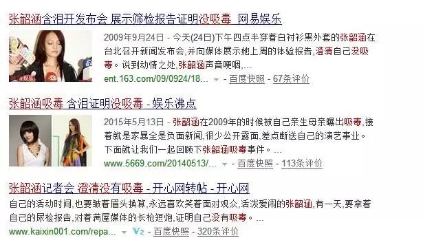当时流传一张张韶涵眼窝下凹、形容枯槁的照片,说是她的吸毒照,后经证实那只是她为家庭操劳而搞得憔悴消瘦而已。