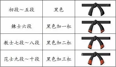 空手道还有个特征是有不同颜色的腰带来表示级别和段位。早先的唐手是没有这种级段位制度的,练习者是裸身,也不需要腰带来扎衣物。所以学习的标准也是由老师来定的,教学内容也是全凭老师的感觉。最早级段位的概念是日本本土发展起来的,据说最早是用来衡量围棋棋士的水平的,也有个说法是看剑术家能把人砍几段。不管源流是什么,段位制度在日本流行起来,剑道、围棋、乃至今天的茶道、花道、书道等等随处可见段位制度。武术方面的段位大致起源于19世纪和20世纪之交。空手道传入日本后大量借鉴了柔道的形制,不仅仅是服装,段位也是在20世纪40年代由船越义珍首次引入空手道系统的,而此时的柔道早就沿用段位制半个多世纪了。