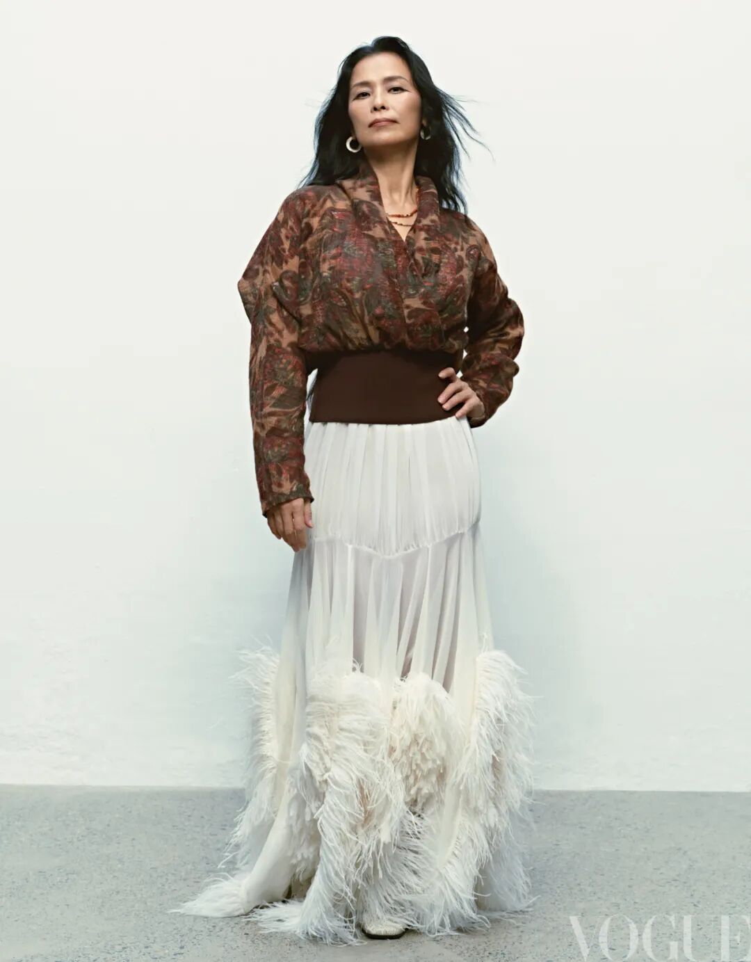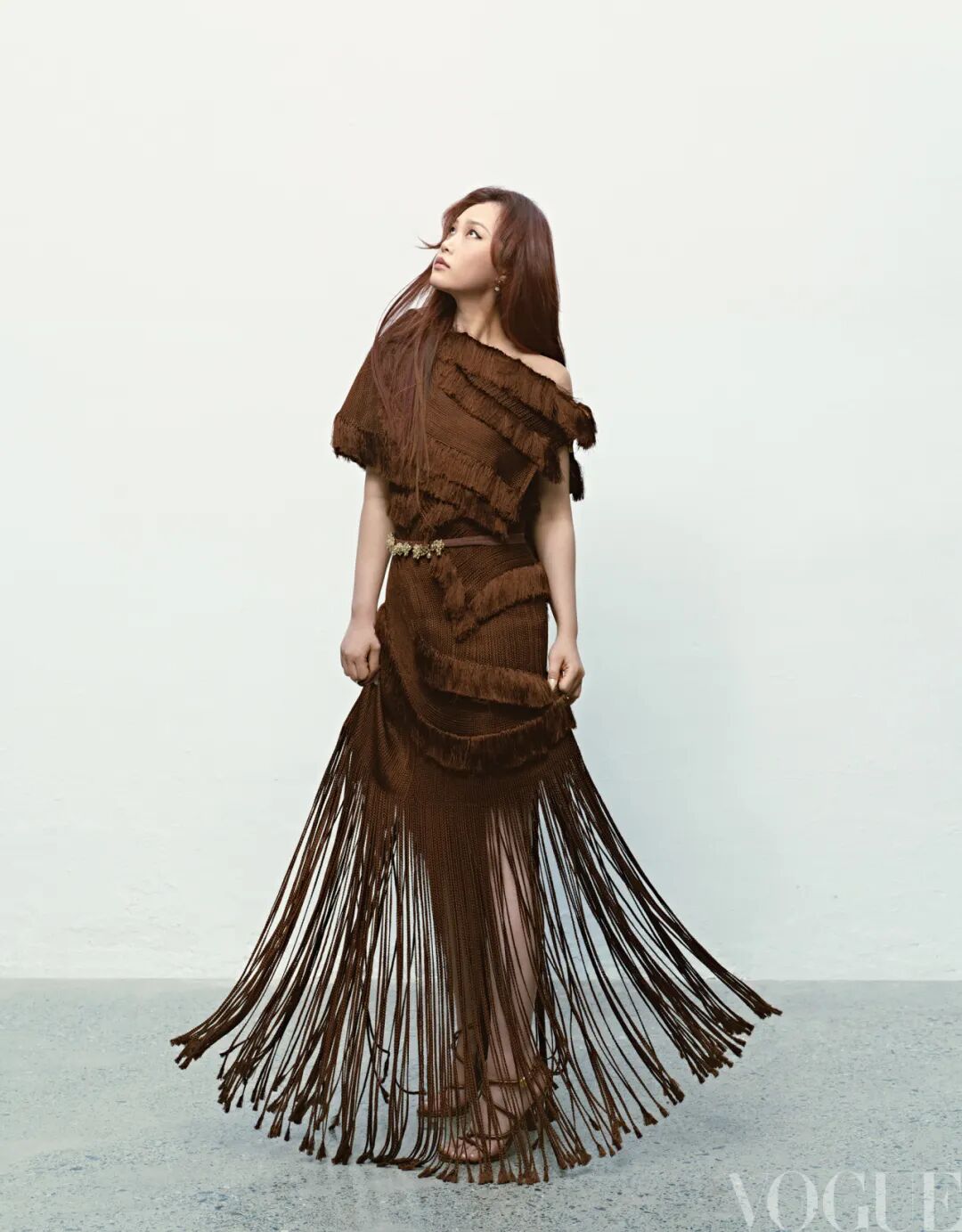 陈婧霏:棕色流苏连衣裙、流苏披肩、金属立体垂坠装饰飘带 均为Xu Zhi;