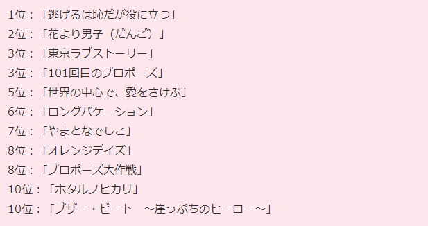 随着今年5月年号的更换,日本的平成时代也即将结束,在这任何事都被称作“平成最后的XX”的年末,日本卫星频道スカパーJSAT就对全国1000名15~69岁男女做了调查,请大家从平成时代播出的日剧中选出「即使现在再看一次仍会感动的恋爱日剧」。