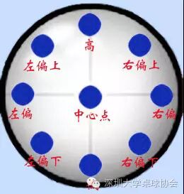 击球点位 如下图所示,球杆枪头击打母球的不同点位能控制母球跑位,打定位球选择击打中心点,若要打跟球则选择高位即所谓的高杆,若希望母球撞击目标球后回球则选择低位,既所谓的低杆。要打弧线球则需要击打偏位,这都是高手才能掌握的。 提示击球点的体会,可以到qq的桌球游戏中去感受。