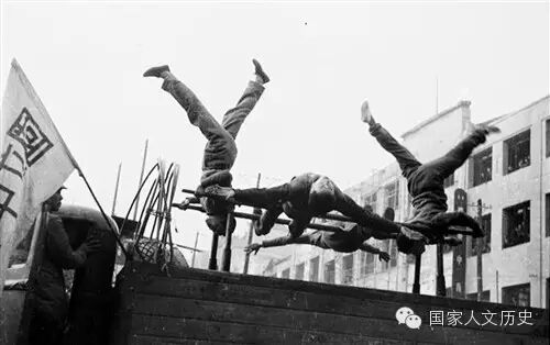 1940年1月1日,重庆市民为庆祝元旦举行体育表演游行大会。图为参加体育表演的体操运动员在进行双杠表演。