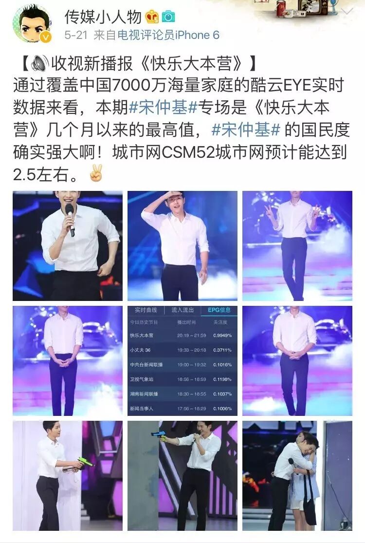 上周六,“老公”宋仲基亮相《快乐大本营》,全程玩嗨了!大秀中文和好身材,上演制服诱惑,高能花式撩妹,不仅撩遍快乐家族,还与贾玲甜蜜互动,成为网友力挺的新晋全民cp!节目播出后创下《快本》2016年收视新高:CSM全国网收视率2.61,份额破8%。52城市网收视率也高达2.429,排名第一。双网全部夺冠,大数据见证宋仲基超强国民度!