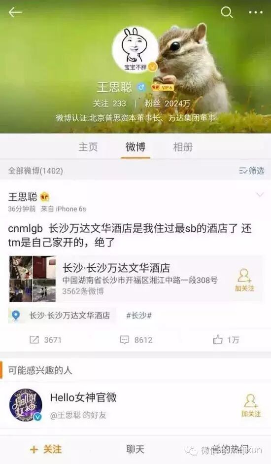 今天最火的一个地方,可能就是长沙万达文华酒店了,原因是什么呢?原来是国民老公王思聪在参加真人秀《Hello!女神》活动后,当晚下榻了自家开的酒店,但是在凌晨2:37分,却发了这样一条微博,大骂长沙万达文华酒店是自己住过最差的酒店,而且还是自己家开的,绝了。。。