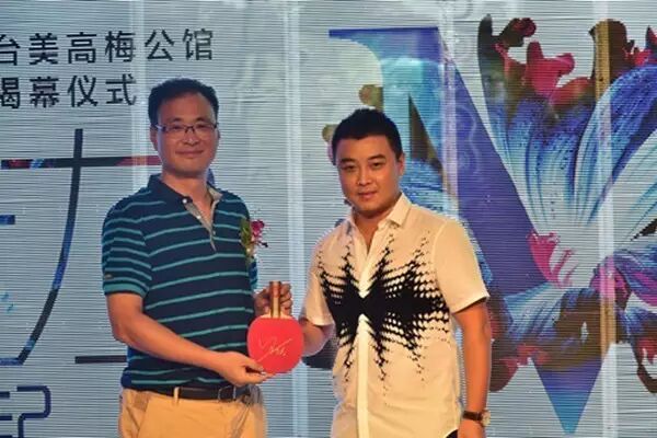 ▲奥运冠军王皓将签名球拍赠予鲁能集团王卫刚先生
